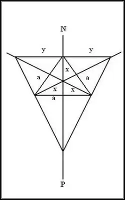 « Soit x la médiane prolongement d'une des Personnes a, 2y le côté du triangle auquel elle est perpendiculaire, N et P les prolongements de la droite (a+x) dans les deux sens à l'infini.
