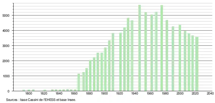 L'évolution du nombre d'habitants est connue à travers les recensements de la population effectués dans la commune depuis 1793. Pour les communes de moins de 10000habitants, une enquête de recensement portant sur toute la population est réalisée tous les cinqans, les populations de référence des années intermédiaires étant quant à elles estimées par interpolation ou extrapolation[64]. Pour la commune, le premier recensement exhaustif entrant dans le cadre du nouveau dispositif a été réalisé en 2006[65].