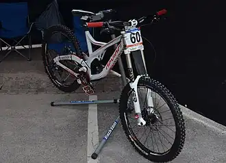 La fourche est un modèle double T, dont le diamètre des plongeurs est relativement important (35-40 mm)[5]. L'axe de roue est surdimensionné, 20 mm pour une plus grande rigidité (assurant une plus grande sensibilité). De nombreux réglages sont disponibles sur les modèles haut de gamme : précontrainte, compression basse et haute vitesse, détente et parfois durcissement en fin de course. La détente se produit grâce à un ressort hélicoïdal (acier, titane) ou pneumatique. La fourche est la plupart du temps d'environ 200 mm de débattement.
