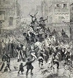 Cette année-là les membres de la troupe du Cirque Moderne eurent l'idée de rentrer dans Paris en parade. Comme ils avaient passé la nuit à fêter Carnaval tout en haut de la rue de Belleville[15] dans le village du même nom, la parade passa devant la masse des fêtards de la Courtille qui sortait des guinguettes qui fermaient. La foule emboîta le pas. Ce fut la première édition de la très célèbre[16] descente de la Courtille.
