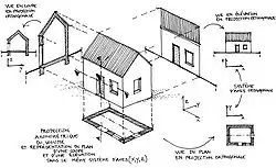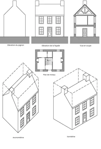 • Projections, telle que l'élévation, projection sur un plan vertical d'une face de l'objet à représenter : façade principale, façade latérale, etc. ;
