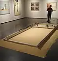 Table traçante « lissant » du sable, œuvre contemporaine dans un musée.