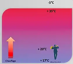 - à la consommation d’énergie de chauffage nécessaire pour obtenir la température de consigne. La surchauffe de l'atmosphère haute (inutile) est alors une source de déperdition proportionnelle à l'écart de température (involontaire).