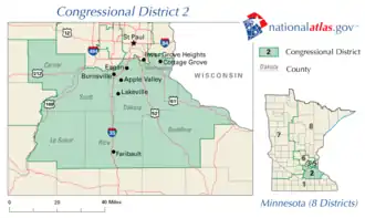 Le 2e district congressionnel du Minnesota couvre la région métropolitaine sud de Twin Cities et contient la totalité des comtés de Scott, Dakota et Le Sueur. Il contient également une partie du nord et de l'est du Comté de Rice, y compris la ville de Northfield, ainsi que le sud du Comté de Washington, y compris la ville de Cottage Grove. Lakeville et Eagan sont les plus grandes villes du district. Historiquement, pendant de nombreuses décennies au milieu du siècle, le 2e district couvrait le coin sud-ouest de l'État, tandis que le 1er district couvrait la majeure partie de cette partie de l'État.