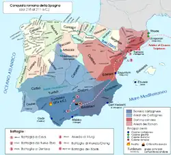 À partir de 237, les Carthaginois s'étendent rapidement dans le Sud de l'Ibérie sous la conduite d'un membre de la famille des Barcides : Hamilcar Barca, puis son gendre Hasdrubal. Avec le bassin fertile du Guadalquivir, les mines de plomb argentifère de la sierra Morena et de la puissante colonie de Qart Hadasht[7], ainsi que la soumission des indigènes, cette région devient un grenier de blé, une riche région d'extraction de métaux précieux et une aire de recrutement de soldats appréciés[8].