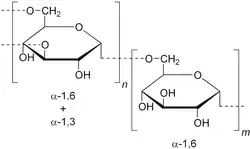 Les glucoses de ce polysaccharide sont reliés par des liaisons alpha 1-6, il possède des ramifications constituées de liaisons alpha 1-3 ou 1-4.