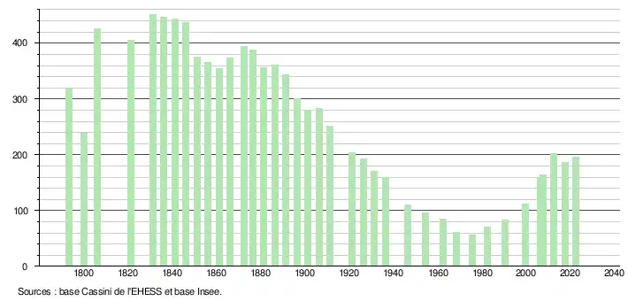 L'évolution du nombre d'habitants est connue à travers les recensements de la population effectués dans la commune depuis 1793. Pour les communes de moins de 10 000 habitants, une enquête de recensement portant sur toute la population est réalisée tous les cinq ans, les populations de référence des années intermédiaires étant quant à elles estimées par interpolation ou extrapolation[13]. Pour la commune, le premier recensement exhaustif entrant dans le cadre du nouveau dispositif a été réalisé en 2007[14].