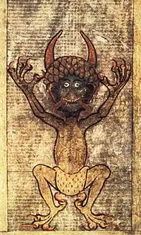 À partir du Haut Moyen Âge, l’iconographie chrétienne représente le diable comme un être anthropomorphe effrayant, velu, avec des cornes, des griffes et les caractéristiques du bouc (cornes, pieds et queue fourchue), représentations qui proviendraient du folklore de l'incube[17], du dieu romain Pan ou encore des satyres[16]. Cette iconographie ne devient vraiment courante et accessible qu'avec les églises romanes dont la statuaire et les vitraux donnent corps au démon décrit dans les Historiæ du moine Raoul Glaber qui est le premier, au début du XIe siècle, à décrire le diable issu d'un de ses songes comme un être de petite taille, la peau ridée, un visage difforme, le crâne allongé avec un museau de chien et des oreilles hérissées, une barbe de bouc, des griffes, les cheveux sales et raides, les dents d’un chien, une bosse sur le dos, les fesses pendantes, les vêtements malpropres[18].