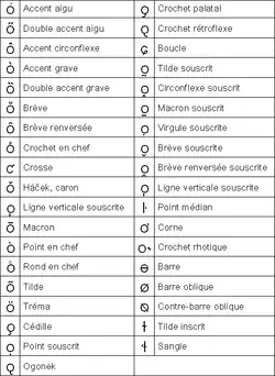 Le français utilise les diacritiques suivants (les liens renvoient vers des articles spécifiques à l'utilisation de ces diacritiques dans la langue française et non aux articles généraux) :
