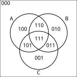 Les diagrammes de Venn correspondent à des tables de vérité pour les propositions , , etc., dans le sens où chaque région du diagramme de Venn correspond à une ligne de la table de vérité[19],[20].