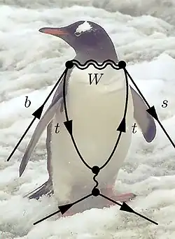 L'émission puis la réabsorption par un quark changeant de saveur d'un boson W ou Z permet l'émission d'un autre boson de jauge : γ, gluon ou Z. On nomme alors le diagramme pingouin électronique, électrofaible ou gluonique.