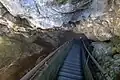 La visite se poursuit en remontant un long escalier de fer à côté de la chute d'eau. On débouche au-dessus de l'abîme le long de la route.