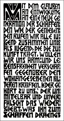 Le manifeste qu'ils publient sous forme de xylogravure en 1906 résume ces principes. Il dit littéralement : « Avec la croyance dans le développement d'une nouvelle génération de créateurs et de jouisseurs, nous appelons tous les jeunes à se rassembler et, en tant que jeunes qui portent l'avenir, nous voulons nous assurer une liberté de mouvement et de vie face aux forces âgées bien établies. Celui qui exprime directement et authentiquement ce qui le pousse à créer fait partie de nous. »[2].