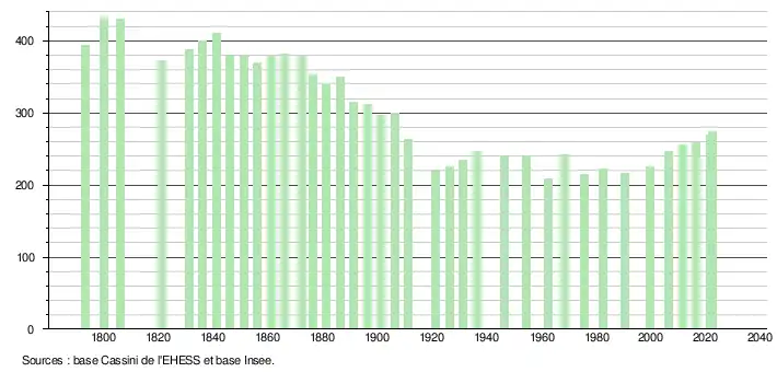 L'évolution du nombre d'habitants est connue à travers les recensements de la population effectués dans la commune depuis 1793. Pour les communes de moins de 10 000 habitants, une enquête de recensement portant sur toute la population est réalisée tous les cinq ans, les populations de référence des années intermédiaires étant quant à elles estimées par interpolation ou extrapolation[21]. Pour la commune, le premier recensement exhaustif entrant dans le cadre du nouveau dispositif a été réalisé en 2006[22].