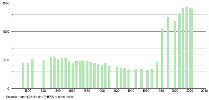 L'évolution du nombre d'habitants est connue à travers les recensements de la population effectués dans la commune depuis 1793. Pour les communes de moins de 10 000 habitants, une enquête de recensement portant sur toute la population est réalisée tous les cinq ans, les populations de référence des années intermédiaires étant quant à elles estimées par interpolation ou extrapolation[30]. Pour la commune, le premier recensement exhaustif entrant dans le cadre du nouveau dispositif a été réalisé en 2005[31].