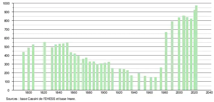 L'évolution du nombre d'habitants est connue à travers les recensements de la population effectués dans la commune depuis 1793. Pour les communes de moins de 10 000 habitants, une enquête de recensement portant sur toute la population est réalisée tous les cinq ans, les populations de référence des années intermédiaires étant quant à elles estimées par interpolation ou extrapolation[26]. Pour la commune, le premier recensement exhaustif entrant dans le cadre du nouveau dispositif a été réalisé en 2005[27].
