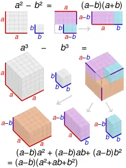 Une autre preuve géométrique procède comme suit : on commence avec la figure montrée dans le premier schéma ci-dessous, un grand carré dont un plus petit carré a été retiré. Le côté du carré entier est a, et le côté du petit carré retiré est b. L'aire de la région ombrée est . Une coupe est effectuée, divisant la région en deux morceaux rectangulaires, comme présenté sur le deuxième schéma. La plus grande pièce, en haut, a une largeur a et une hauteur a-b. La plus petite pièce, en bas, a une largeur a-b et une hauteur b. Maintenant, la plus petite pièce peut être détachée, tournée et placée à droite de la plus grande pièce. Dans cette nouvelle disposition, illustrée dans le dernier schéma ci-dessous, les deux pièces forment ensemble un rectangle, dont la largeur est et dont la hauteur est . L'aire de ce rectangle est . Étant donné que ce rectangle provient de la réorganisation de la figure d'origine, il doit avoir la même aire que la figure d'origine. Donc, .