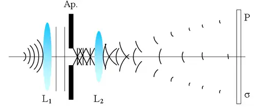 La source ponctuelle doit être très éloignée de l'ouverture plane pour que les ondes qui parviennent jusqu'à l'objet réfractant soient planes ou quasi planes et l'observation se fait à l'infini. De plus, d'après le principe de Huygens-Fresnel, chaque point de l'objet diffractant se comporte comme une source secondaire dont les amplitudes sont toutes égales et sont toutes en phase avec l'onde incidente. Ces conditions sont celles de l'approximation de Fraunhofer. En pratique, pour que ces conditions soient réalisées, on place en entrée et en sortie des lentilles convergentes afin de faire les observations dans le plan focal image de la lentille de sortie et de modéliser une source à l'infini[1].