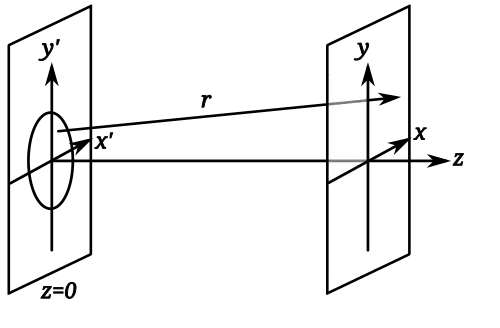 Cette formule peut être trouvée à partir de l'intégrale de diffraction de Kirchhoff, où l'expression de la distance est approchée à l'aide d'un développement limité (dimensions transverses petites devant z).