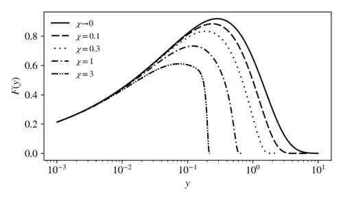 Cette expression est égale à l'expression classique lorsque est égal à un et peut être développée dans deux cas limites : proches de la limite classique et lorsque les effets quantiques sont prépondérants[13],[28] :Une grandeur intéressante est le taux d’émission des photons :où il est explicitement indiqué que l'intégration se limite à la condition qu'aucun photon ne peut être émis lorsque [23]. Ce taux d'émission dépend explicitement du paramètre quantique de l'électron et du facteur de Lorentz pour l'électron.