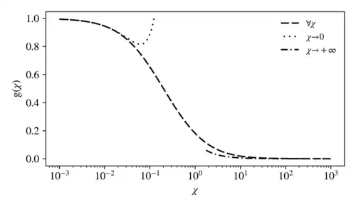 Graphe de pour l'expression complète (), pour la version approchée lorsque , et dans l'approximation pour les grandes valeurs lorsque .
