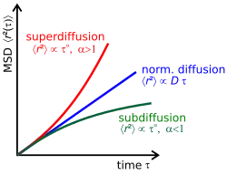 - : superdiffusion. La superdiffusion peut être le résultat de processus de transport cellulaire actif ou de sauts avec une longue traîne[4].