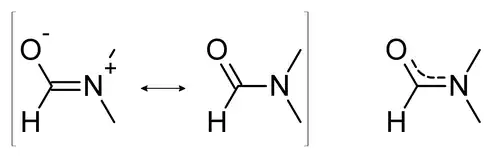 Du fait de la contribution de deux formes de résonance possibles, l'indice de liaison de la liaison carbonyle C=O est diminuée, tandis que celui de la liaison carbone-azote est augmenté. Ainsi, le spectre infrarouge du DMF laisse apparaître une bande plus basse (de fréquence 1 675 cm−1[13]) que celle d'un groupe carbonyle (C=O) non substitué. Aussi, à cause du caractère partiellement double de la liaison C-N, la rotation autour de son axe est gênée, et lente. Les deux méthyles ne sont donc pas équivalents en spectroscopie RMN (faisant apparaître deux singulets de trois protons, au lieu d'un seul singulet de six protons).