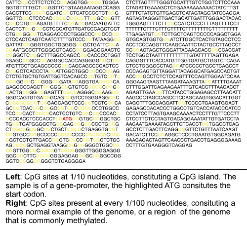 L'îlot CpG représenté ici est un promoteur, dont le codon d'initiation — ATG — est souligné en rouge.