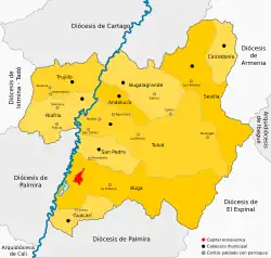 Il comprend les municipalités d'Andalucía, Buga, Bugalagrande, Caicedonia, Guacarí, Riofrío, San Pedro, Sevilla, Trujillo et Tuluá du département de Valle del Cauca ce qui correspond à un territoire d'une superficie de 3 997 km2 divisé en 70 paroisses.
