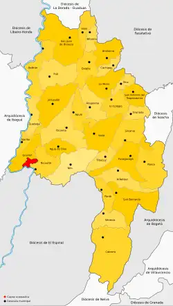 Il comprend également 33 municipalités du département de Cundinamarca : Agua de Dios, Anapoima, Anolaima, Apulo, Arbeláez, Beltrán, Bituima, Cabrera, Cachipay, El Colegio, Fusagasugá, Girardot, Granada, Guataquí, Jerusalén, La Mesa, Nariño, Nilo, Pandi, Pasca, Pulí, Quipile, Ricaurte, San Antonio del Tequendama, San Bernardo, San Juan de Rioseco, Silvania, Tena, Tibacuy, Tocaima, Venecia, Vianí et Viotá.