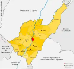 - ↑ Le diocèse de Tolima, avec siège épiscopal à Neiva, est érigé le 30 août 1894 par la constitution apostolique Illud semper du pape Léon XIII en prenant une partie du territoire du diocèse de Popayán (aujourd'hui archidiocèse de Popayán) et de l'archidiocèse de Santa Fé de Nouvelle-Grenade (aujourd'hui archidiocèse de Bogota) dont Tolima devient suffragant[1],[2]. Compte tenu de l'immensité du territoire et des difficultés à satisfaire les besoins spirituels des fidèles, le diocèse est supprimé le 20 mai 1900 par le décret Quum legitimae de la congrégation pour les évêques et son territoire divisé pour la création des diocèses de Garzón et d'Ibagué (aujourd'hui archidiocèse d'Ibagué) et une autre partie de son territoire incorporée au diocèse de Popayán[3].