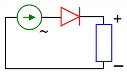 - Elles peuvent être utilisées en courant alternatif pour diminuer la puissance fournie par l'alimentation à un récepteur : en supprimant l'une des alternances, elles permettent de diviser par deux la puissance transmise à la charge[23] pour un coût très modique. Cette technique est par exemple utilisée pour obtenir deux puissances de chauffe dans les sèche-cheveux, une diode, placée en série avec la résistance de chauffage, est mise en court-circuit par un interrupteur pour obtenir la puissance de chauffe maximale[n 5].