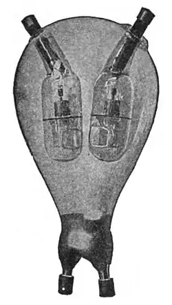 Les premières diodes étaient réalisées dans une enveloppe mise sous vide dont on avait rempli le fond avec du mercure[6]. L'ampoule permet de faire condenser la vapeur formée lors du fonctionnement de l'appareil. L'enveloppe de verre possède un à plusieurs bras dans lesquels sont disposées des barres de graphite, qui servent d'anode. Leur nombre dépend de l'application, en général chaque phase est associée à une anode. La géométrie de l'enveloppe doit permettre au mercure qui se condense de retourner rapidement dans la piscine afin d'éviter la formation d'un chemin conducteur entre l'anode et la cathode.