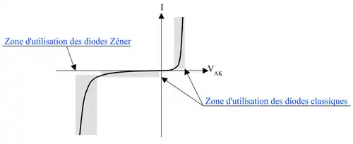 Une diode Zener est un assemblage de deux semi-conducteurs dont les propriétés électriques ont été découvertes par le physicien américain Clarence Zener. Contrairement à une diode conventionnelle qui ne laisse passer le courant électrique que dans un seul sens, le sens direct, les diodes Zener sont conçues de façon à laisser également passer le courant inverse, mais ceci uniquement si la tension à ses bornes est plus élevée que le seuil de l'effet d'avalanche. Ce seuil en tension inverse (tension Zener) est de valeur déterminée pouvant aller de 1,2 V à plusieurs centaines de volts[1]. Certaines diodes Zener comportent une troisième broche qui permet de régler cet effet d'avalanche.