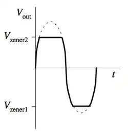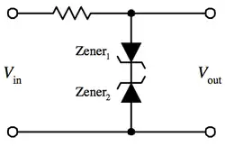 Deux diodes Zener se faisant face en série écrêtent les deux moitiés d'un signal d'entrée. L' écrêtage d'ondes peuvent être utilisés non seulement pour remodeler un signal, mais aussi pour éviter que les pics de tension n'affectent les circuits connectés à l'alimentation[8].
