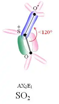 SO2 est une molécule coudée dans laquelle l'atome de soufre est à l'état d'oxydation +4. Du point de vue de la théorie des orbitales moléculaires, la plupart des électrons de valence sont engagés dans une liaison S=O.