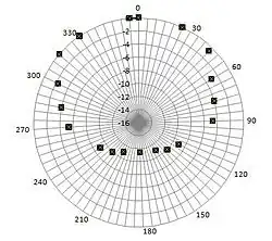 Enfin, le diagramme de directivité est fréquemment utilisé par les fabricants pour représenter par une courbe la directivité, généralement dans le plan horizontal. Pour un angle donné, il représente l'atténuation en décibels par rapport à l'axe principal.