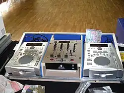 Un disc jockey lors d'un événement utilisant une platine disque et un DJ mixer (en), une petite table de mixage utilisée pour la transition entre les chansons.