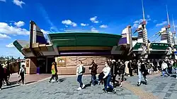 À droite, un théâtre accueille Captain EO de 1992 à 1997 avant d'être remplacé par Chérie, j'ai rétréci le public. En hommage à Michael Jackson, le film est diffusé du 12 juin 2010 au 12 avril 2015. Réalisé par George Lucas et Francis Ford Coppola, ce dernier possède un style proche de Star Wars.