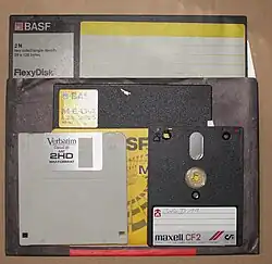 À gauche : disquette 8″ ; centre haut : disquette 5¼″ ; en bas : disque Bernoulli Iomega ; à droite : disquette 3½″ ; en haut à droite : un DVD+R (pour comparaison de taille).