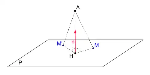 Dans l'espace euclidien , la distance d'un point à un plan est la plus courte distance séparant ce point et un point du plan. Le théorème de Pythagore permet d'affirmer que la distance du point A au plan (P) correspond à la distance séparant A de son projeté orthogonal H sur le plan (P).