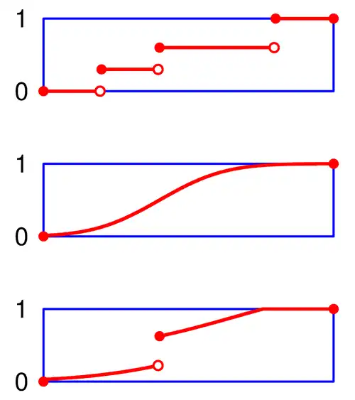 La fonction de répartition est alors une fonction constante par intervalles et sa représentation graphique est en escalier. Les sauts d'une marche à l'autre de l'escalier se situent aux abscisses si, et l'amplitude du saut d'abscisse s est ps = FX(s) – FX(s–). En particulier la fonction de répartition d'une variable discrète X est discontinue exactement aux points s tels que Voir la section Propriétés de la fonction de répartition pour une démonstration.