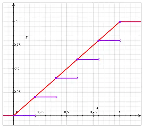 Pour les variables aléatoires discrètes les plus courantes (par exemple, les lois uniformes, binomiales, de Poisson) S est un ensemble bien ordonné : on peut alors numéroter ses éléments de manière croissante, p.e. s1 ≤ s2 ≤ s3 ≤ ... et numéroter les probabilités ps en conséquence, p.e. en posant pi = psi, i ≥ 1. On a alors, si x ∈ [si, si + 1[,