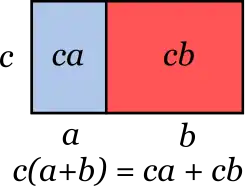 En arithmétique, les deux opérations considérées lorsqu'on parle de distributivité sont l'addition et la multiplication. La multiplication est distributive par rapport à l'addition :