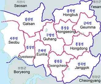 Le district est composé de deux eups (petite ville) et de neuf myeons (commune). Gwangcheon a obtenu le statut de eup en 1942 tandis que Hongju-myeon est devenue Hongseong-eup en 1941[7].