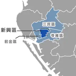 - (en) Cet article est partiellement ou en totalité issu de l’article de Wikipédia en anglais intitulé « Sinsing District, Kaohsiung » (voir la liste des auteurs).
