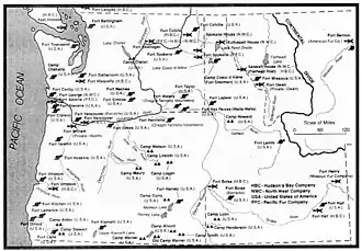 - ↑ A temporary state militia post that lasted only one month. Located at the mouth of the Clackamas about one mile north of Oregon City. Replaced Camp Barlow.