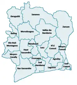 Avant , le premier niveau de subdivisions administratives de la Côte d'Ivoire était les régions. En 2011, les régions ont été réorganisées en 14 districts (12 districts réguliers et deux districts autonomes)[5],[6] par la loi no 2011-262 du . Voici un résumé de la façon dont les districts ont été construits à partir des anciennes régions :
