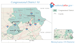 Le 10e district congressionnel de Pennsylvanie est actuellement situé dans la région centre-sud de l'État. Il englobe tout le comté de Dauphin ainsi que certaines parties des comtés de Cumberland et de York. Le district comprend les villes de Harrisburg et York. Avant 2019, le district était situé dans la partie nord-est de l'État. La Cour suprême de Pennsylvanie a redessiné le district en 2018 après avoir jugé la carte précédente inconstitutionnelle en raison du gerrymandering. Le tribunal a ajouté le State College aux limites de l'ancien district tout en supprimant certaines zones à tendance démocrate et l'a rebaptisé 12e district ; une zone englobant Harrisburg et York était numérotée 10e. Le nouveau 10e district est représenté par le Républicain Scott Perry, qui représentait auparavant l'ancien 4e district[1].