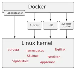Docker permet la mise en œuvre de conteneurs s'exécutant en isolation, via une API de haut-niveau. Construit sur des capacités du noyau Linux (surtout les cgroups et espaces de nommage), un conteneur Docker, à l'opposé de machines virtuelles traditionnelles, ne requiert aucun système d'exploitation séparé et n'en fournit aucun. Il s'appuie plutôt sur les fonctionnalités du noyau et utilise l'isolation de ressources (comme le processeur, la mémoire, les entrées et sorties et les connexions réseau) ainsi que des espaces de noms séparés pour isoler le système d'exploitation tel que vu par l'application. Docker accède aux capacités de virtualisation du noyau Linux, soit directement à travers la bibliothèque runc (disponible depuis Docker 0.9), soit indirectement via libvirt, LXC (Linux Containers) ou systemd-nspawn.